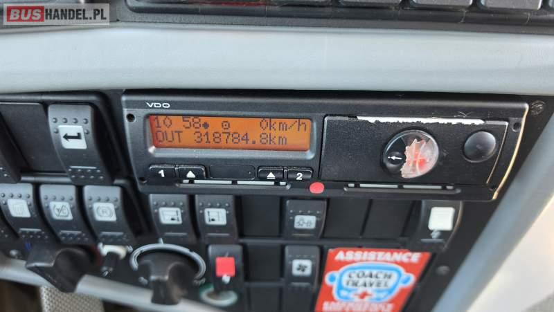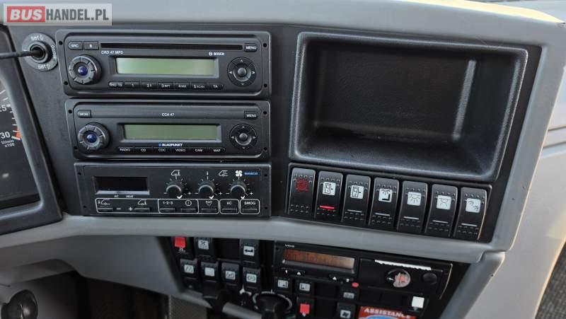 Wyposażenie: klimatyzacja, lodówka, oświetlenie indywidualne, nawiewy dyszowe, fotele odchylane, podnóżki, ABS, ASR, tempomat, retarder, CD, radio, regulacja wysokości nadwozia, centralny zamek, podwójne szyby boczne, wspomaganie kierownicy, elektryczne lusterka, ogrzewanie stacjonarne