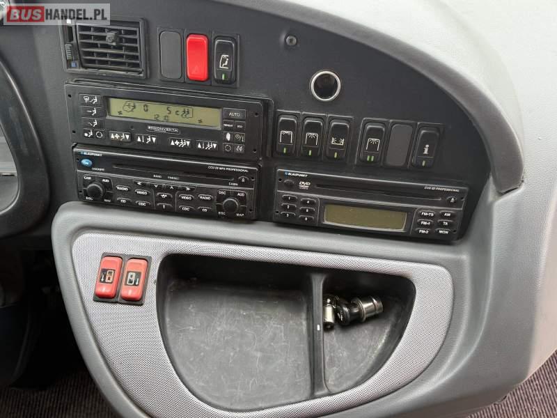 Wyposażenie: video, WC, lodówka, caffebar, oświetlenie indywidualne, nawiewy dyszowe, siateczki, ABS, ASR, tempomat, retarder, CD, podnóżki, stoliczki, mikrofon, klimatyzacja, radio, regulacja wysokości nadwozia, centralny zamek, podwójne szyby boczne, wspomaganie kierownicy, elektryczne lusterka, fotele odchylane i rozsuwane, DVD, ogrzewanie stacjonarne, ESP